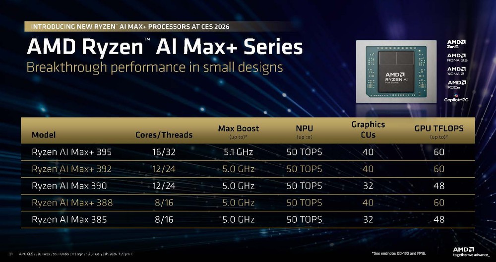 A grande novidade aqui são os modelos 392 e 388, que trazem a mesma GPU grande do top de linha 395, implicando em um desempenho similar ao do PS5 em portáteis, mas com um custo mais baixo.
