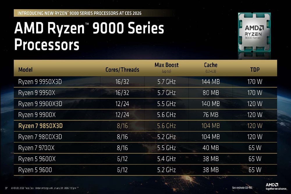 Voltado ao público gamer entusiasta, o Ryzen 7 9850X3D mantém a fórmula do 3D V-Cache aliada à arquitetura Zen 5. O foco segue em altas taxas de quadros e maior consistência em jogos competitivos, com compatibilidade direta com o soquete AM5, facilitando upgrades para usuários da plataforma atual.