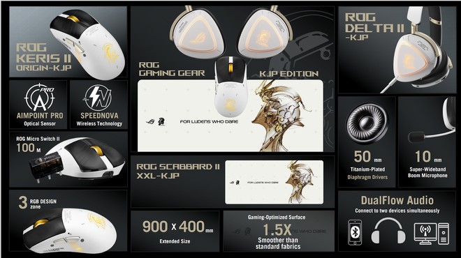 Junto do Flow Z13, o trabalho com a Kojima Productions vai incluir edições "KJP" do mouse ROG Keris II Origin, do mousepad ROG Scabbard II XXL e do headset ROG Delta II.