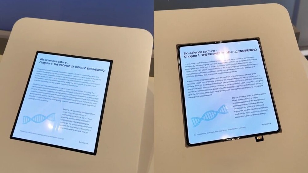 O painel foi demonstrado lado a lado do que parece ser um Galaxy Z Fold 7 para oferecer uma comparação direta aos visitantes da feira.